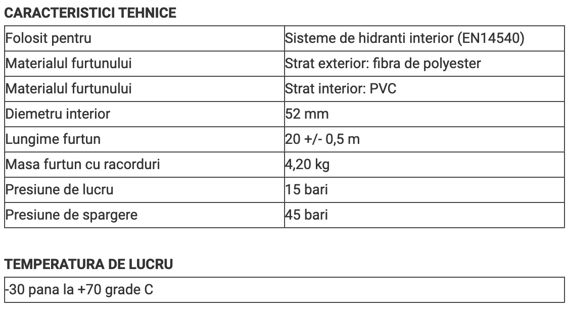 Folosit pentru: Sisteme de hidranti interior (EN14540) Materialul furtunului Strat exterior: fibra de polyester Materialul furtunului Strat interior: PVC Diemetru interior: 52 mm Lungime furtun: 20 +/- 0,5 m Masa furtun cu racorduri: 4,20 kg Presiune de lucru: 15 bari Presiune de spargere: 45 bari